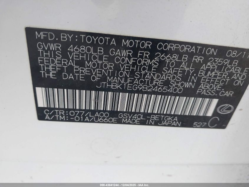 Колір БілийЦиліндри 6Привід Передній привідVIN JTHBK1EG9B2465400Стан Заводиться та їде (перевірено)Ушкодження Передня або задня AutoRIA