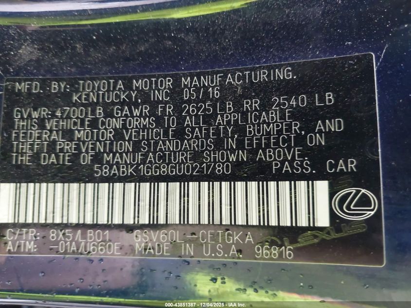 2016 LEXUS ES 350 2016 року Бензин, 3.5, Передній привід, vin - 58ABK1GG8GU021780 з США