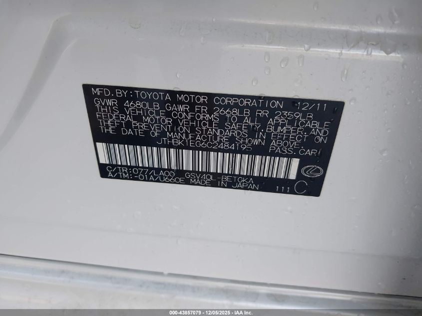 2012 LEXUS ES 350 2012 року Бензин, 3.5, Передній привід, vin - JTHBK1EG6C2484195 з США