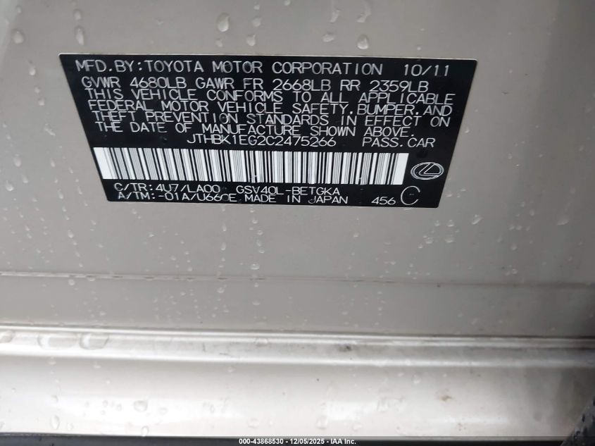 Колір ЗолотийЦиліндри 6Привід Передній привідVIN JTHBK1EG2C2475266Стан СтаціонарноУшкодження По всьому авто AutoRIA