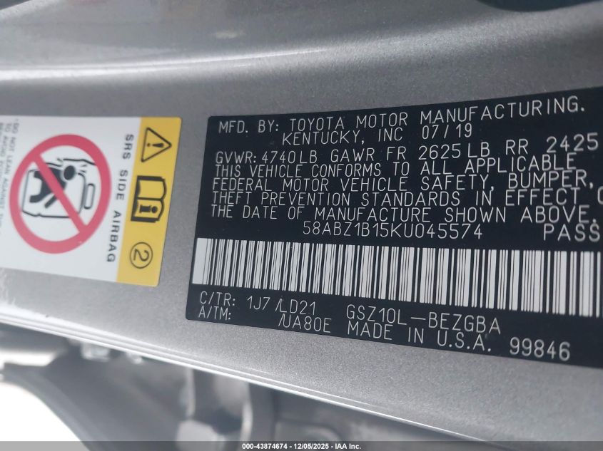 2019 LEXUS ES 350 2019 року Бензин, 3.5, Передній привід, vin - 58ABZ1B15KU045574 з США