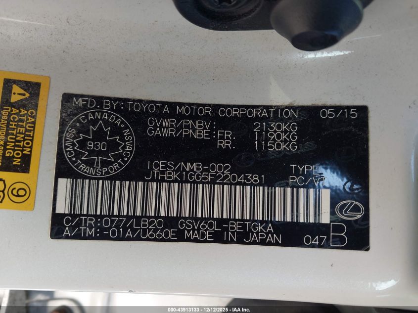 Колір БілийЦиліндри 6Привід Передній привідVIN JTHBK1GG5F2204381Стан ЗаводитьсяУшкодження Передня або задня AutoRIA
