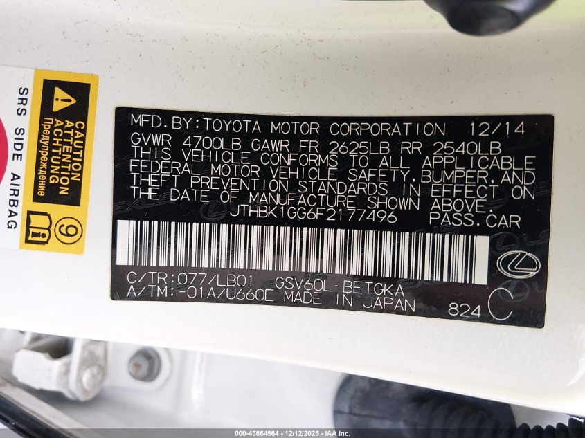 Колір БілийЦиліндри 6Привід Передній привідVIN JTHBK1GG6F2177496Стан СтаціонарноУшкодження Передня права AutoRIA