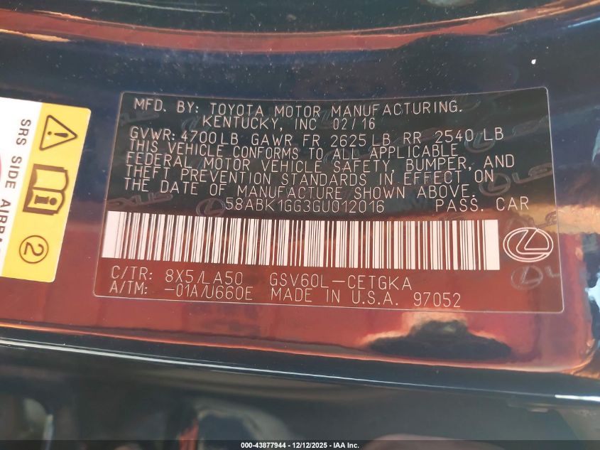 2016 LEXUS ES 350 2016 року Бензин, 3.5, Передній привід, vin - 58ABK1GG3GU012016 з США