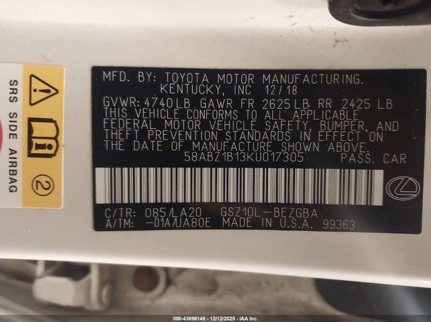 2019 LEXUS ES 350 2019 року Бензин, 3.5, Передній привід, vin - 58ABZ1B13KU017305 з США