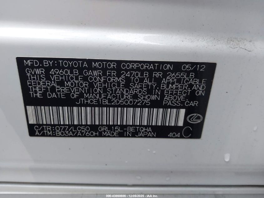 Колір БілийЦиліндри 6Привід Повний привідVIN JTHCE1BL2D5007275Стан СтаціонарноУшкодження Передня або задня AutoRIA