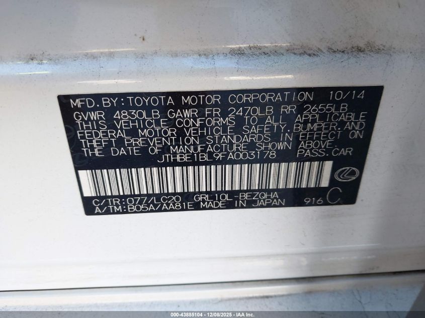 Колір БілийЦиліндри 6Привід Задній привідVIN JTHBE1BL9FA003178Стан Заводиться та їде (перевірено)Ушкодження Передня або задня AutoRIA