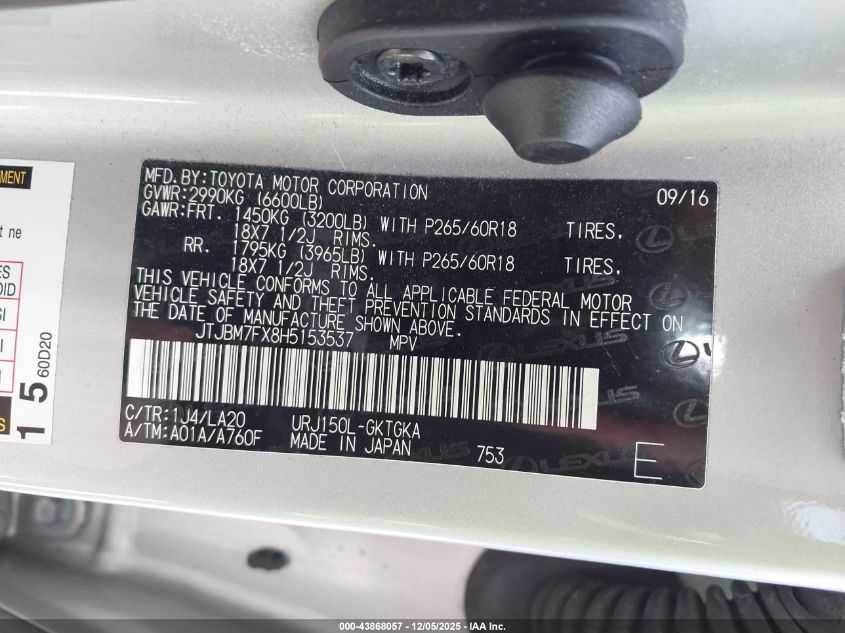 Колір СрібнийЦиліндри 8Привід Повний привідVIN JTJBM7FX8H5153537Стан Заводиться та їде (перевірено)Ушкодження Задня ліва AutoRIA