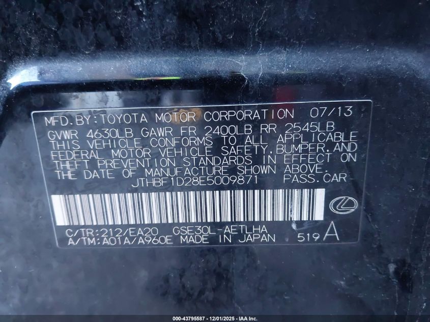 2014 LEXUS IS 250 2014 року Бензин, 2.5, Задній привід, vin - JTHBF1D28E5009871 з США