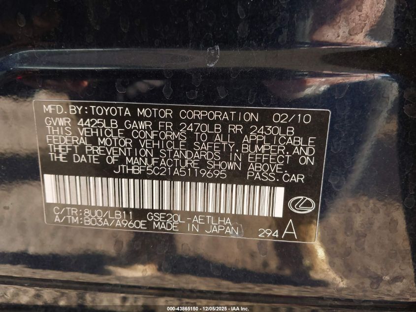 2010 LEXUS IS 250 2010 року Бензин, 2.5, Задній привід, vin - JTHBF5C21A5119695 з США