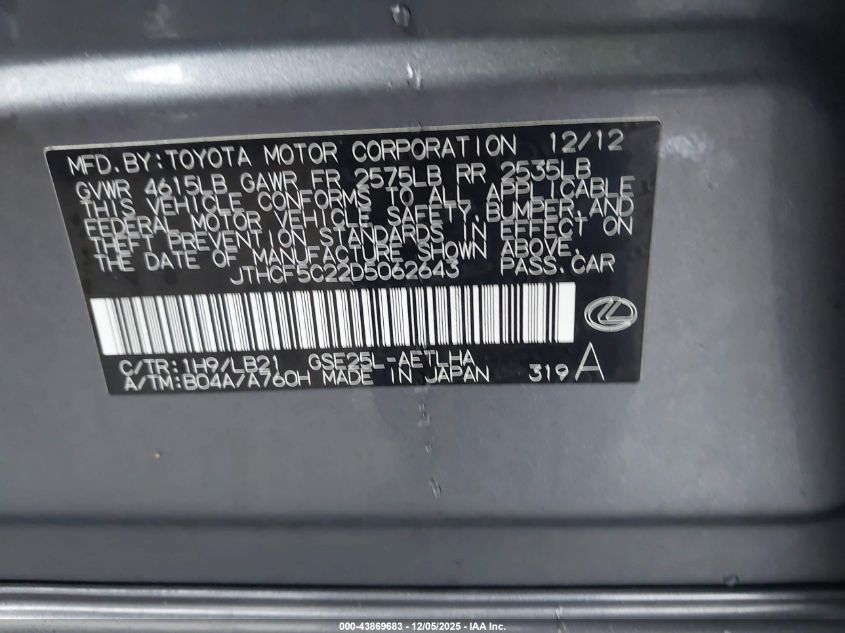 2013 LEXUS IS 250 2013 року Бензин, 2.5, Повний привід, vin - JTHCF5C22D5062643 з США