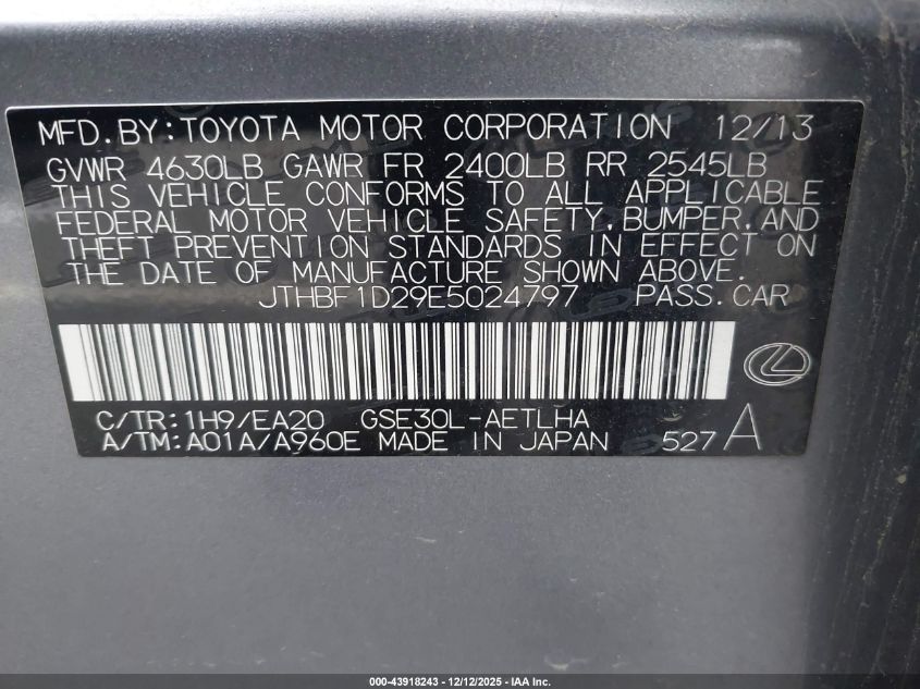 2014 LEXUS IS 250 2014 року Бензин, 2.5, Задній привід, vin - JTHBF1D29E5024797 з США