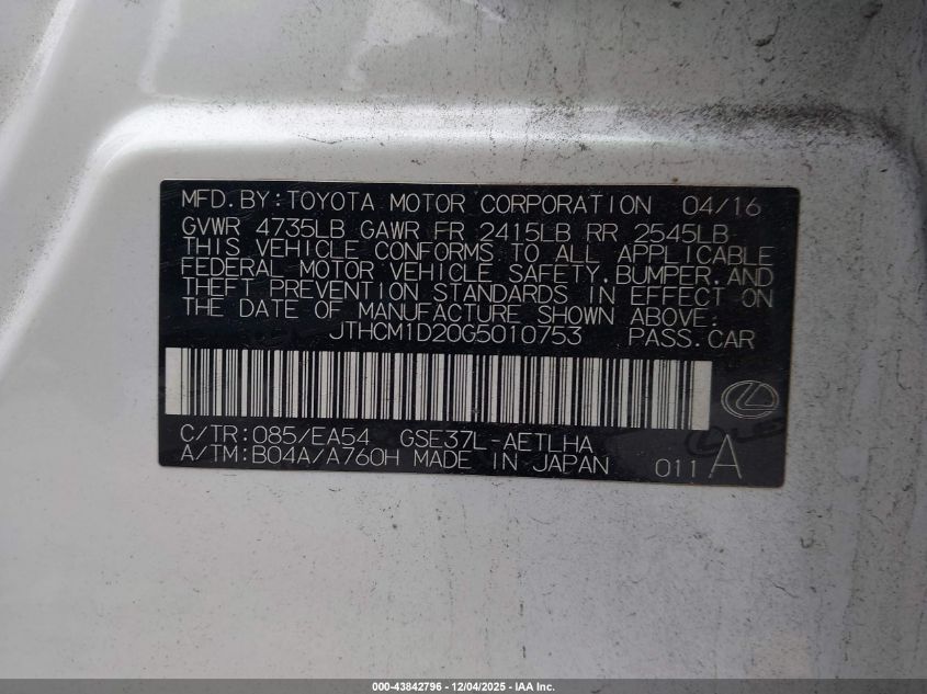 2016 LEXUS IS 300 2016 року Бензин, 3.5, Повний привід, vin - JTHCM1D20G5010753 з США