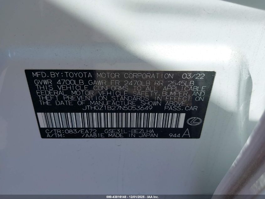 2022 LEXUS IS 350 2022 року Бензин, 3.5, Задній привід, vin - JTHGZ1B27N5053649 з США
