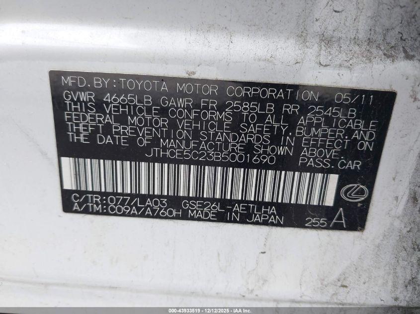 2011 LEXUS IS 350 2011 року Бензин, 3.5, Повний привід, vin - JTHCE5C23B5001690 з США