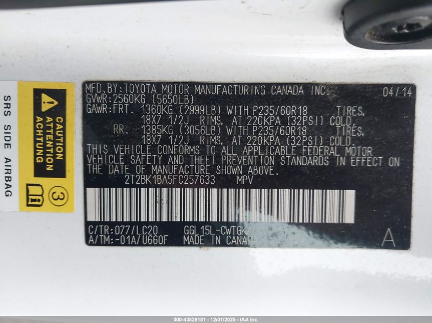 Колір БілийЦиліндри 6Привід Повний привідVIN 2T2BK1BA5FC257633Стан Заводиться та їде (перевірено)Ушкодження Передня або задняДата аукціону 2025-12-10 AutoRIA