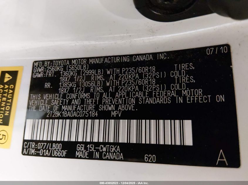 Колір БілийЦиліндри 6Привід Повний привідVIN 2T2BK1BA0AC075184Стан СтаціонарноУшкодження Права сторона AutoRIA