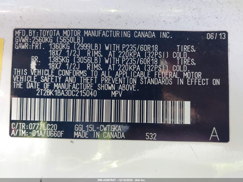 Колір БілийЦиліндри 6Привід Повний привідVIN 2T2BK1BA3DC215040Стан Заводиться та їде (перевірено)Ушкодження Задня AutoRIA