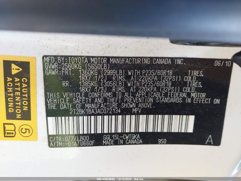 Колір БілийЦиліндри 6Привід Повний привідVIN 2T2BK1BA3AC072134Стан Заводиться та їде (перевірено)Ушкодження Передня ліва AutoRIA