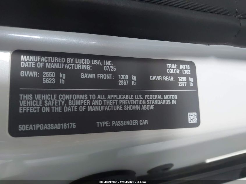 2025 LUCID AIR 2025 року Електричний, U, Задній привід, vin - 50EA1PGA3SA016176 з США