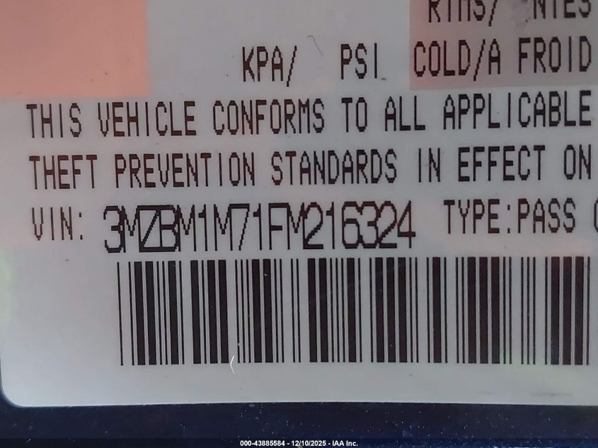 Колір БірюзовийЦиліндри 4Привід Передній привідVIN 3MZBM1M71FM216324Стан Заводиться та їде (перевірено)Ушкодження Передня права AutoRIA