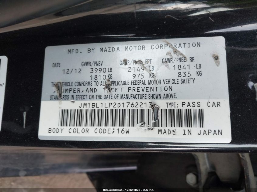 Колір ЧорнийЦиліндри 4Привід Передній привідVIN JM1BL1LP2D1762213Стан Заводиться та їде (перевірено)Ушкодження Передня або задняДата аукціону 2025-12-10 AutoRIA