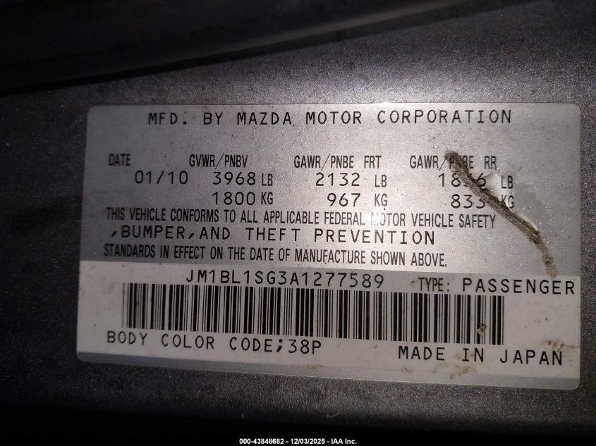 Колір СрібнийЦиліндри 4Привід Передній привідVIN JM1BL1SG3A1277589Стан Заводиться та їде (перевірено)Ушкодження Звичайний зносДата аукціону 2025-12-08 AutoRIA