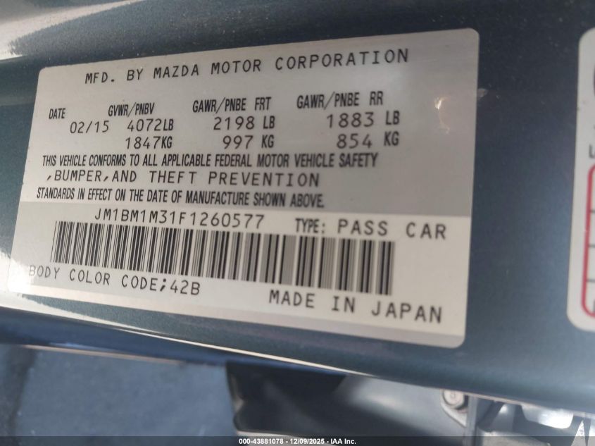 2015 MAZDA 3 2015 року Бензин, 2.5, Передній привід, vin - JM1BM1M31F1260577 з США