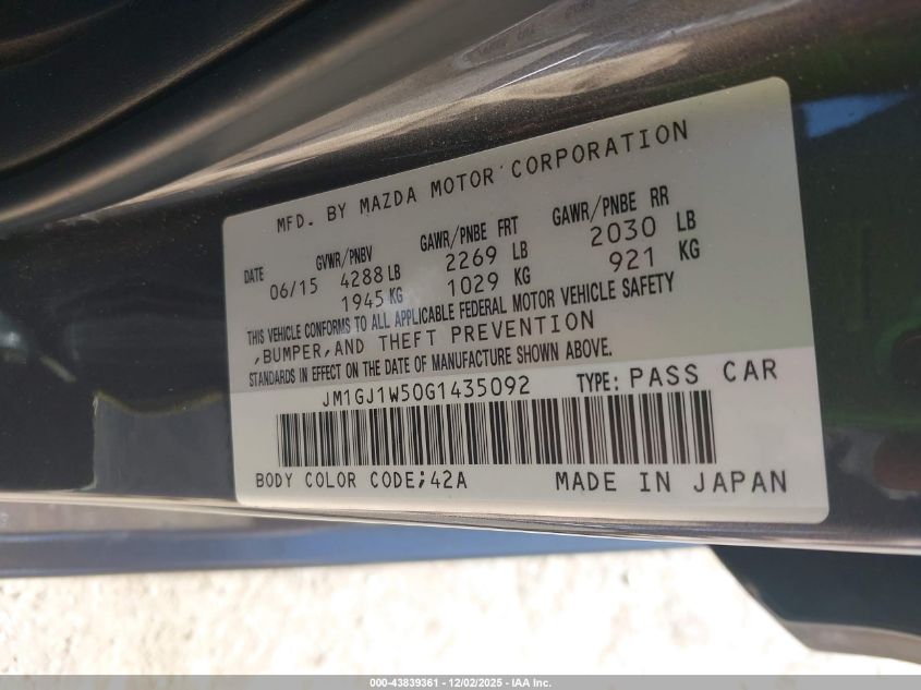 2016 MAZDA 6 2016 року Бензин, 2.5, Передній привід, vin - JM1GJ1W50G1435092 з США