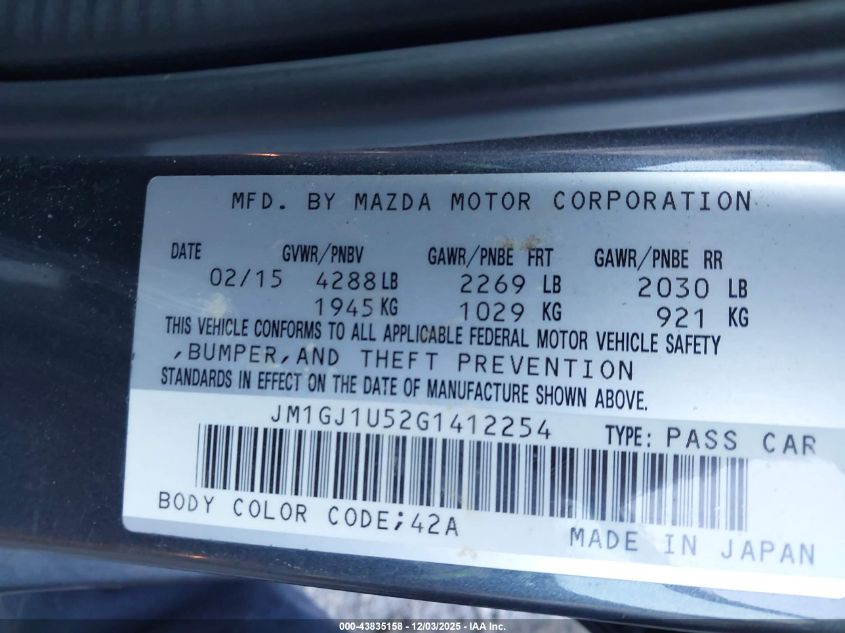 2016 MAZDA 6 2016 року Бензин, 2.5, Передній привід, vin - JM1GJ1U52G1412254 з США