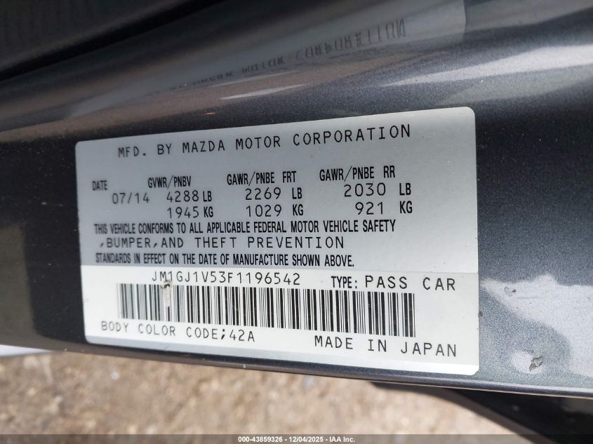 2015 MAZDA 6 2015 року Бензин, 2.5, Передній привід, vin - JM1GJ1V53F1196542 з США