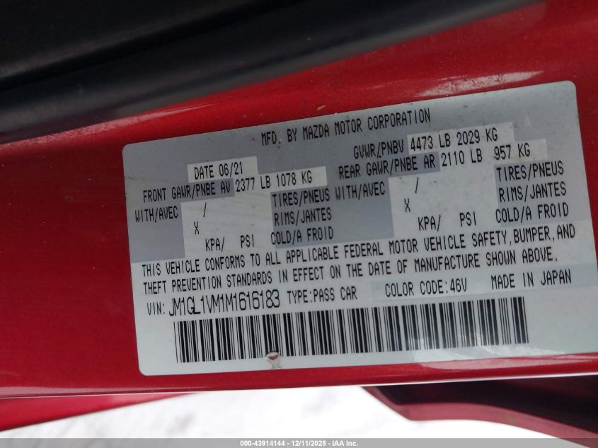 2021 MAZDA 6 2021 року Бензин, 2.5, Передній привід, vin - JM1GL1VM1M1616183 з США