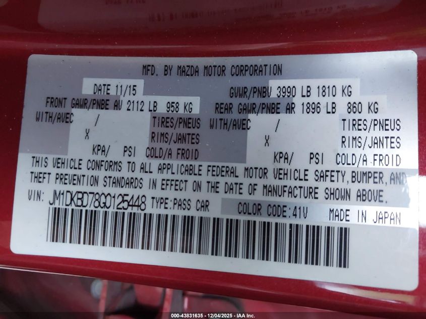 Колір ЧервонийЦиліндри 4Привід Повний привідVIN JM1DKBD78G0125448Стан Заводиться та їде (перевірено)Ушкодження Передня або задня AutoRIA
