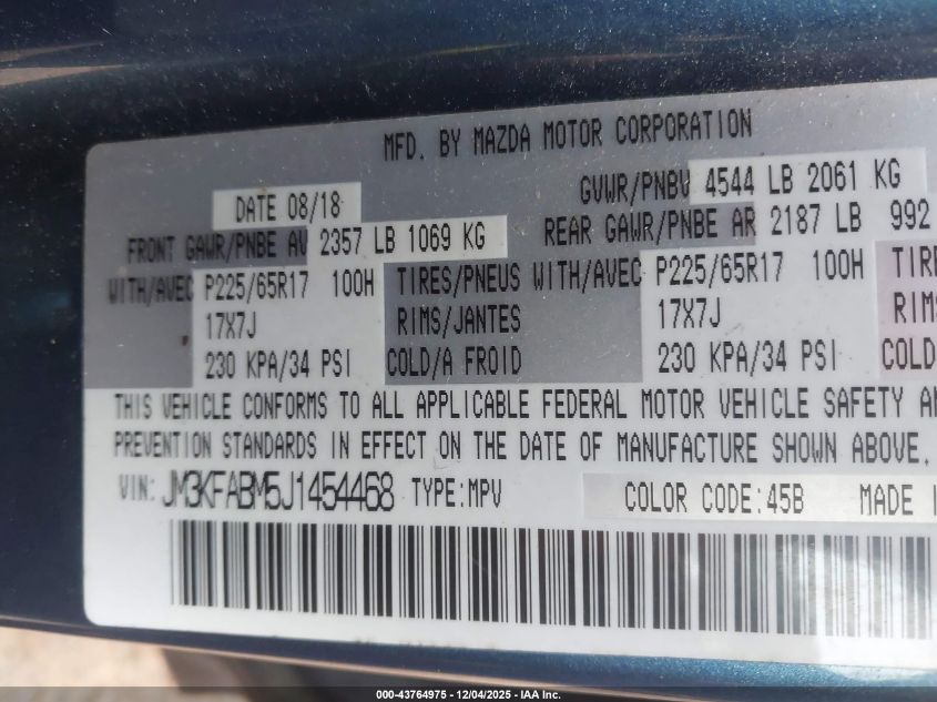 2018 MAZDA CX-5 2018 року Бензин, 2.5, Передній привід, vin - JM3KFABM5J1454468 з США