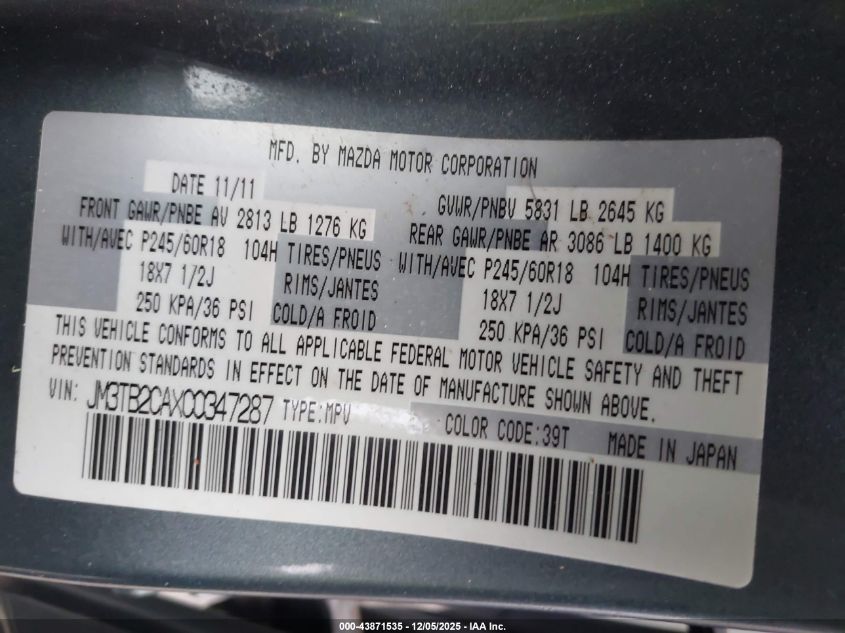 2012 MAZDA CX-9 2012 року Бензин, 3.7, Передній привід, vin - JM3TB2CAXC0347287 з США