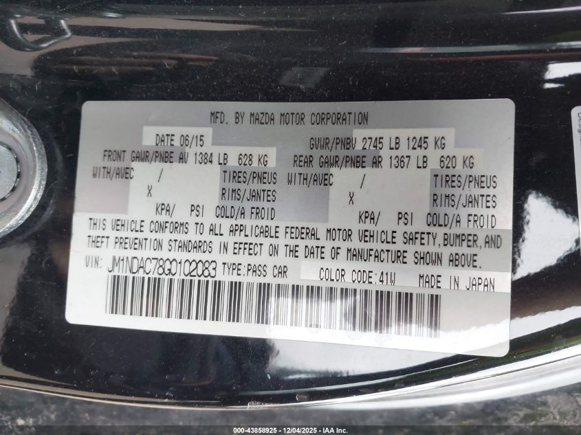 2016 MAZDA MX-5 2016 року Бензин, 2.0, Задній привід, vin - JM1NDAC78G0102083 з США