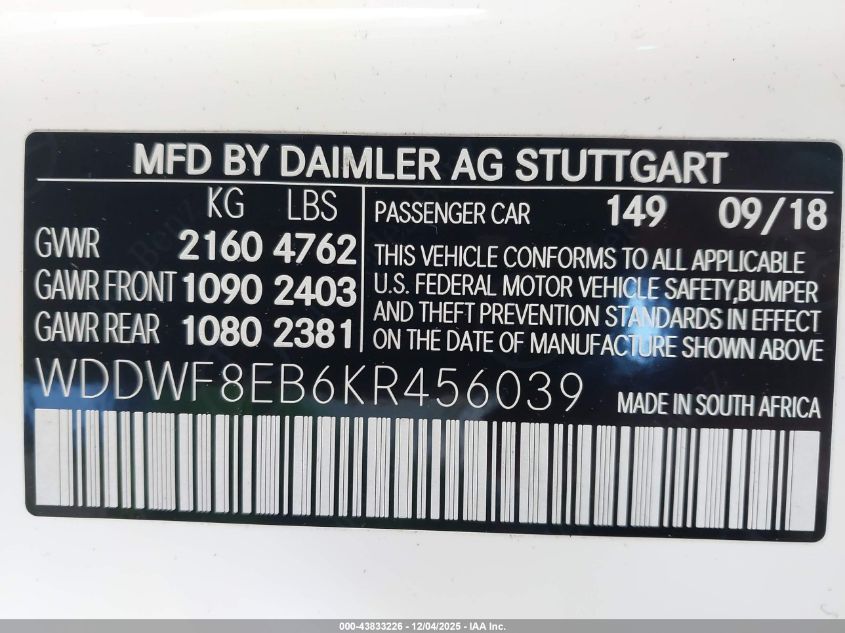 2019 MERCEDES-BENZ C-CLASS 2019 року Бензин, 2.0, Повний привід, vin - WDDWF8EB6KR456039 з США
