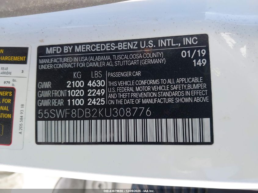 2019 MERCEDES-BENZ C-CLASS 2019 року Бензин, 2.0, Задній привід, vin - 55SWF8DB2KU308776 з США