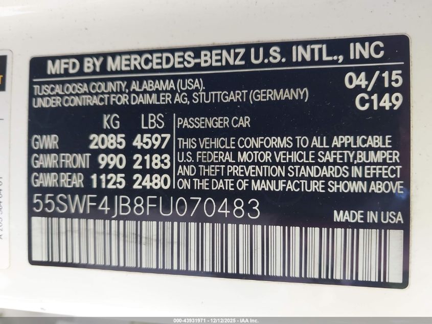 2015 MERCEDES-BENZ C-CLASS 2015 року Бензин, 2.0, Задній привід, vin - 55SWF4JB8FU070483 з США