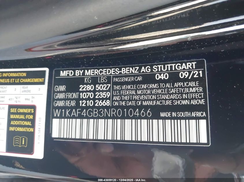 2022 MERCEDES-BENZ C-CLASS 2022 року Бензин, 2.0, Задній привід, vin - W1KAF4GB3NR010466 з США