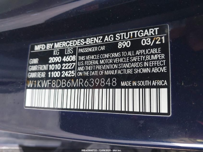 2021 MERCEDES-BENZ C-CLASS 2021 року Бензин, 2.0, Задній привід, vin - W1KWF8DB6MR639848 з США
