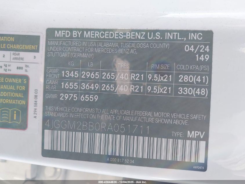 2024 MERCEDES-BENZ EQE SUV 2024 року Електричний, U, , vin - 4JGGM2BB0RA051711 з США