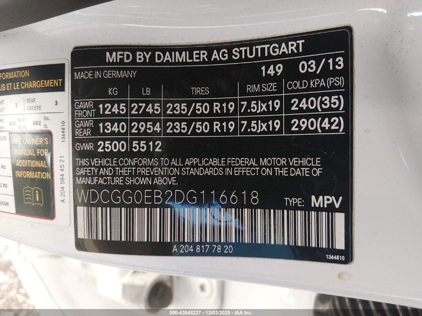 Колір БілийЦиліндри 4Привід Повний привідVIN WDCGG0EB2DG116618Стан Заводиться та їде (перевірено)Ушкодження Передня або задня AutoRIA