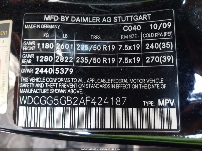 Колір ЧорнийЦиліндри 6VIN WDCGG5GB2AF424187Стан Заводиться та їде (перевірено)Ушкодження Передня або задня AutoRIA