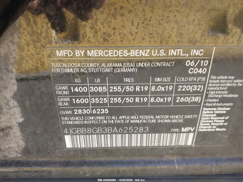 2011 MERCEDES-BENZ M-CLASS 2011 року Бензин, 3.5, Повний привід, vin - 4JGBB8GB3BA625283 з США
