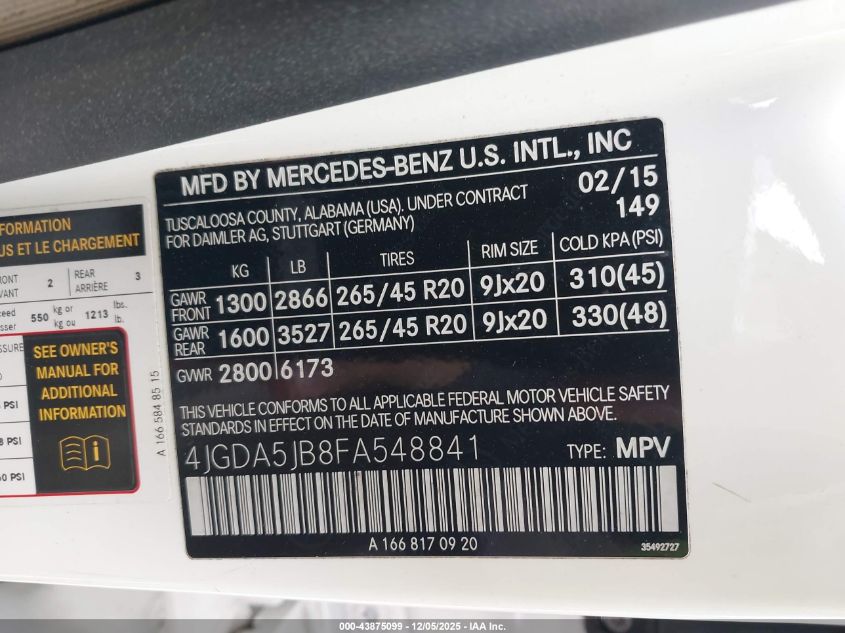 2015 MERCEDES-BENZ M-CLASS 2015 року Бензин, 3.5, , vin - 4JGDA5JB8FA548841 з США