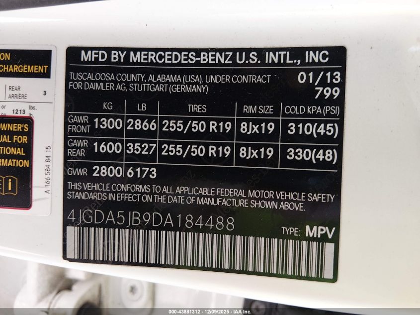 2013 MERCEDES-BENZ M-CLASS 2013 року Бензин, 3.5, , vin - 4JGDA5JB9DA184488 з США