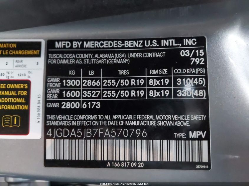 2015 MERCEDES-BENZ M-CLASS 2015 року Бензин, 3.5, , vin - 4JGDA5JB7FA570796 з США