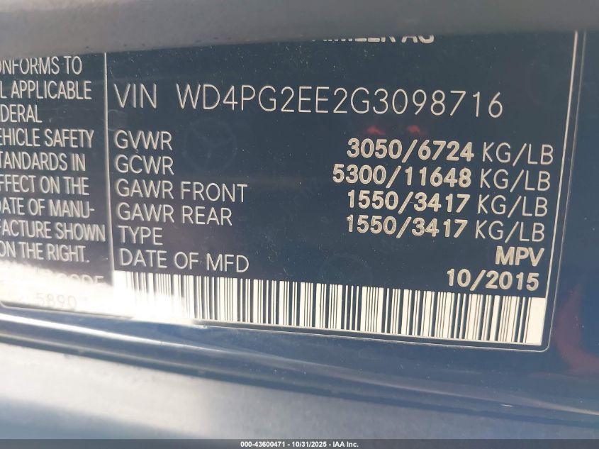 2016 MERCEDES-BENZ METRIS 2016 року Бензин, 2.0, Задній привід, vin - WD4PG2EE2G3098716 з США