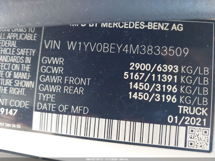 2021 MERCEDES-BENZ METRIS 2021 року Бензин, 2.0, Задній привід, vin - W1YV0BEY4M3833509 з США